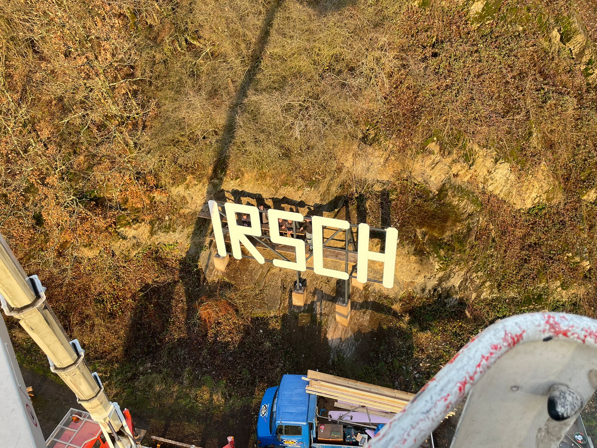 Der Irscher Jugendclub e.V. (IJC) machte aus der Idee ein nachhaltiges Projekt. In den letzten zwei Jahren investierte der Club viel Zeit, Energie und Herzblut in die Weiterentwicklung des Ortes. Die Buchstaben wurden wetterfest erneuert und sicher befestigt, sodass der Schriftzug nun stabil und dauerhaft sichtbar über dem Dorf thront.
